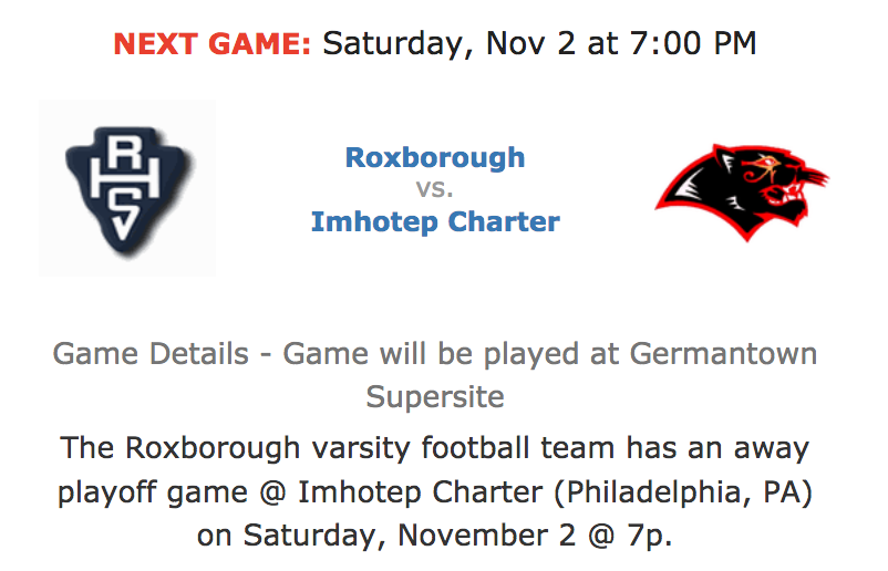 Academies @ Roxborough HS Varsity Football won their first playoff game in the post season. They beat Boys Latin Charter with a final score of 10-8. It was their first playoff win in 9 years. Kahill Edwards had an interception at the Roxborough 1 yard line with 25 seconds to go sealing the win! The next game is an away playoff game @ Imhotep Charter on Saturday, November 2 @ 7p.